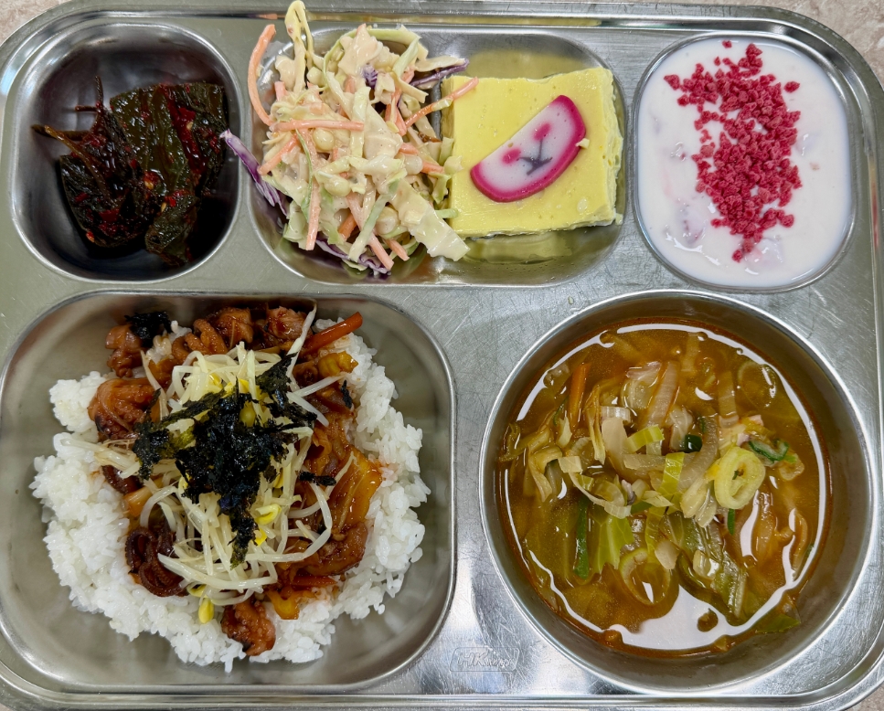 주꾸미비빔밥 (5.6.13)채식짬뽕국 (5.6.9.17.18)앵두어묵달걀찜 (1.5.6.9)양배추샐러드&사우전S (1.2.4.5.6.13)깻잎김치 (9)벚꽃요거트 (2.5.6)우유 (2)
