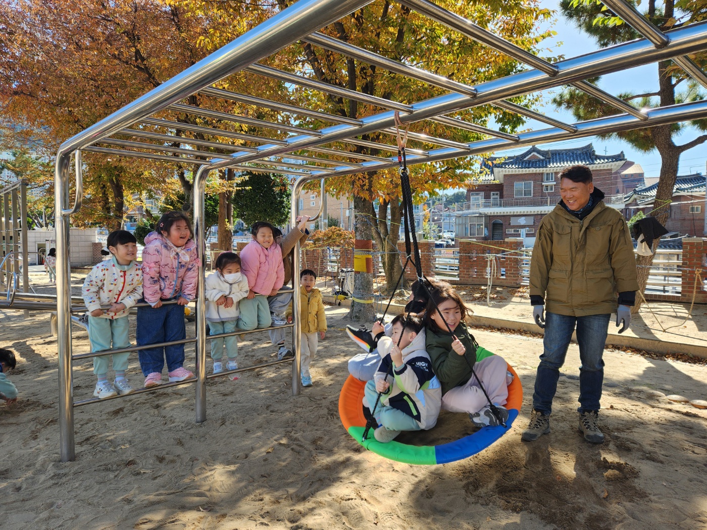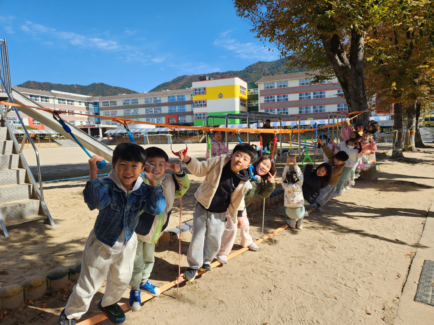 [2025. 11월 찾아오는 밧줄놀이] 창원남산유치원 친구들은 11월에도 밧줄놀이 시간을 무척 기대하며 즐겁게 참여하고 있습니다. 흔들리는 밧줄 위를 조심조심 걸어가며 몸의 중심을 스스로 잡아보는 과정에서 균형 감각이 더욱 자라고, 친구들과 자연스럽게 차례를 지키고 응원해주는 모습도 볼 수 있었습니다. 또한 활동을 마친 뒤에는 넓은 놀이터에서 그네도 타며 신나게 몸을 움직였어요. 밧줄놀이는 아이들이 도전하는 기쁨과 함께 친구들과 함께하는 즐거움을 느낄 수 있는 소중한 놀이 시간이 되고 있습니다.