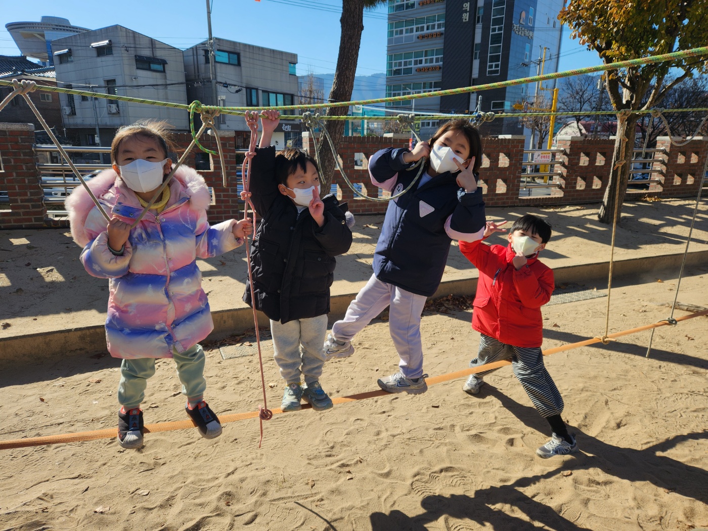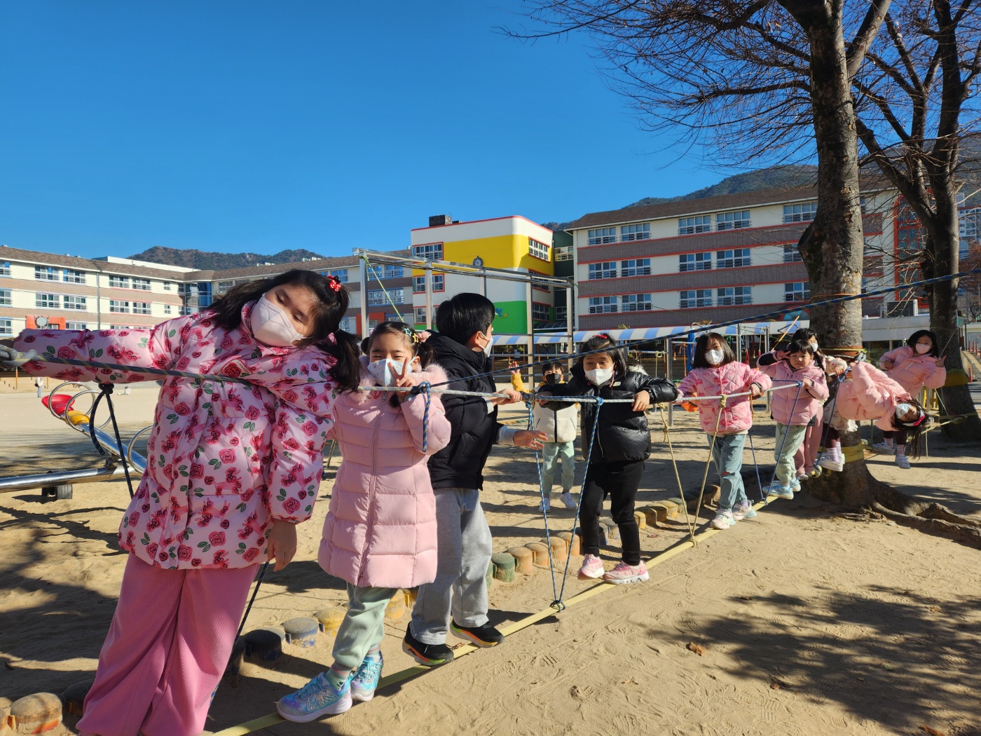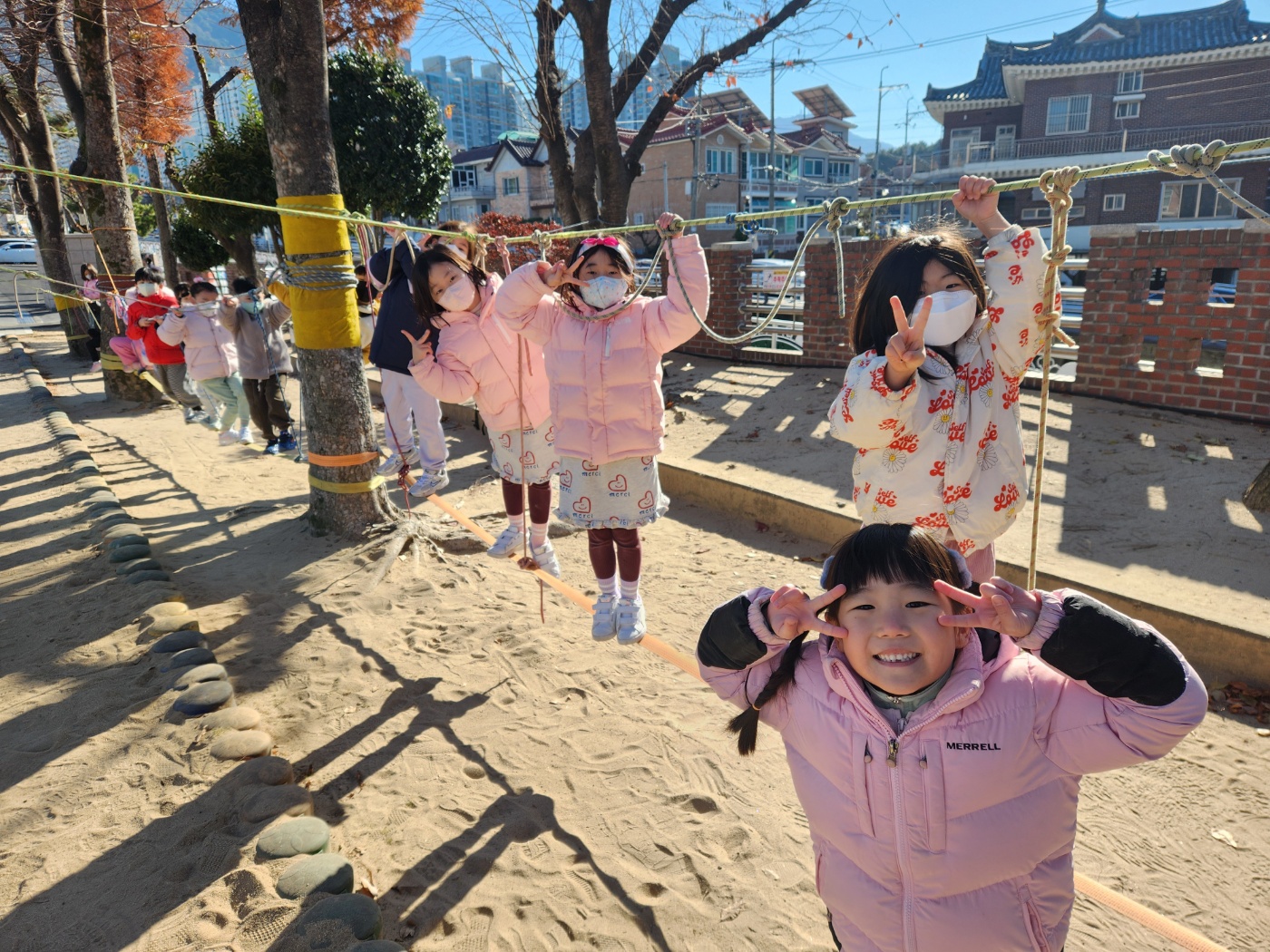 [2025. 12월 찾아오는 밧줄놀이] 12월에도 창원남산유치원 친구들은 찾아오는 밧줄놀이 시간을 손꼽아 기다리며 즐겁게 참여하고 있습니다. 겨울 바람이 솔솔 부는 가운데 흔들리는 밧줄을 조심히 건너며 몸의 균형을 스스로 조절해보는 과정에서 아이들의 집중력과 도전심이 한층 더 성장하는 모습을 볼 수 있었습니다. 밧줄놀이가 끝난 뒤에는 놀이터 곳곳에서 뛰어놀며 시원한 공기를 만끽하고, 그네를 타며 친구들과 웃음소리를 나누는 모습도 인상적이었습니다^^