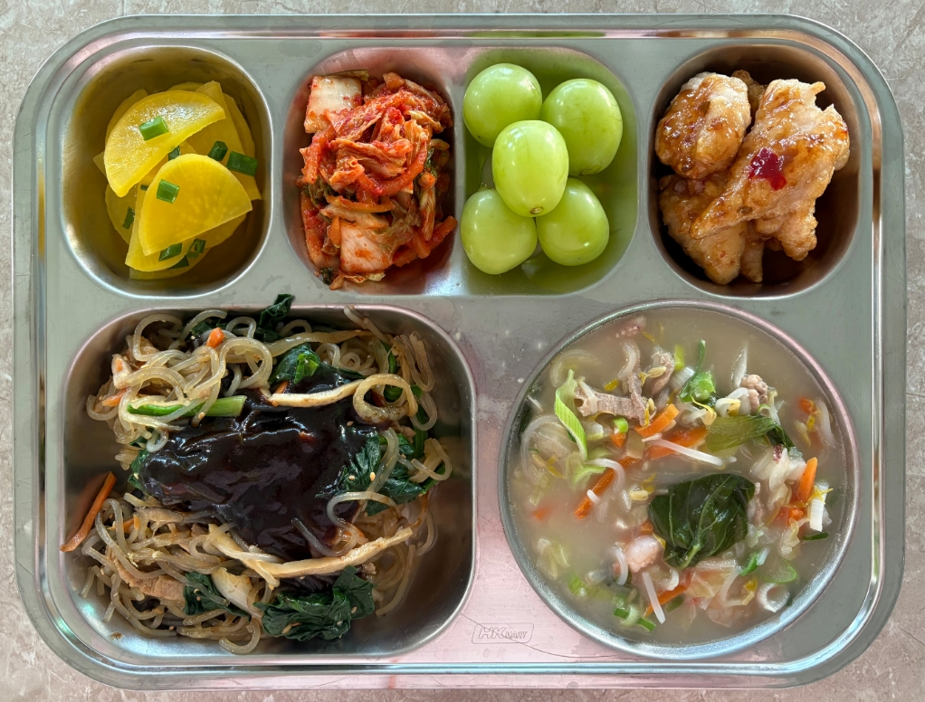 잡채밥&자장소스(1.5.6.10.13.16)백짬뽕국(6.9.10.13.17.18)치킨꿔바로우(1.5.6.10.12.13.18)유자청단무지무침(13)배추김치(9)샤인머스켓우유(2)