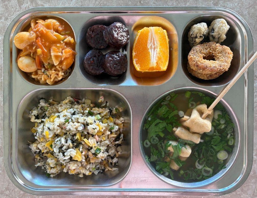 유부김밥볶음밥(1.5.6.8.13)꼬지어묵국(1.5.6.9)라볶이(1.5.6.13)누드찰순대(2.5.6.10.13.16)김말이&오징어링튀김(1.5.6.16.17)한라봉우유(2)