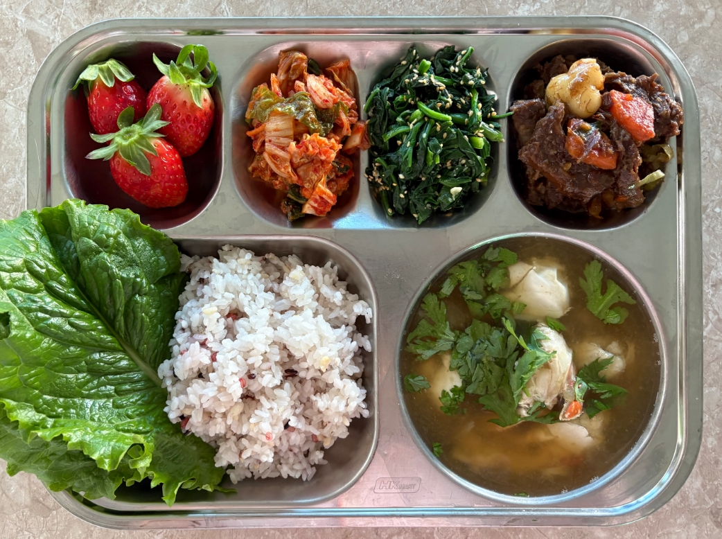 라인업플러스17곡밥(5)꽃게된장국(5.6.8.9)한우갈비찜(5.6.13.16)시금치나물(5.6.18)배추김치(9)상추쌈(자)(5.6.13)딸기우유(2)
